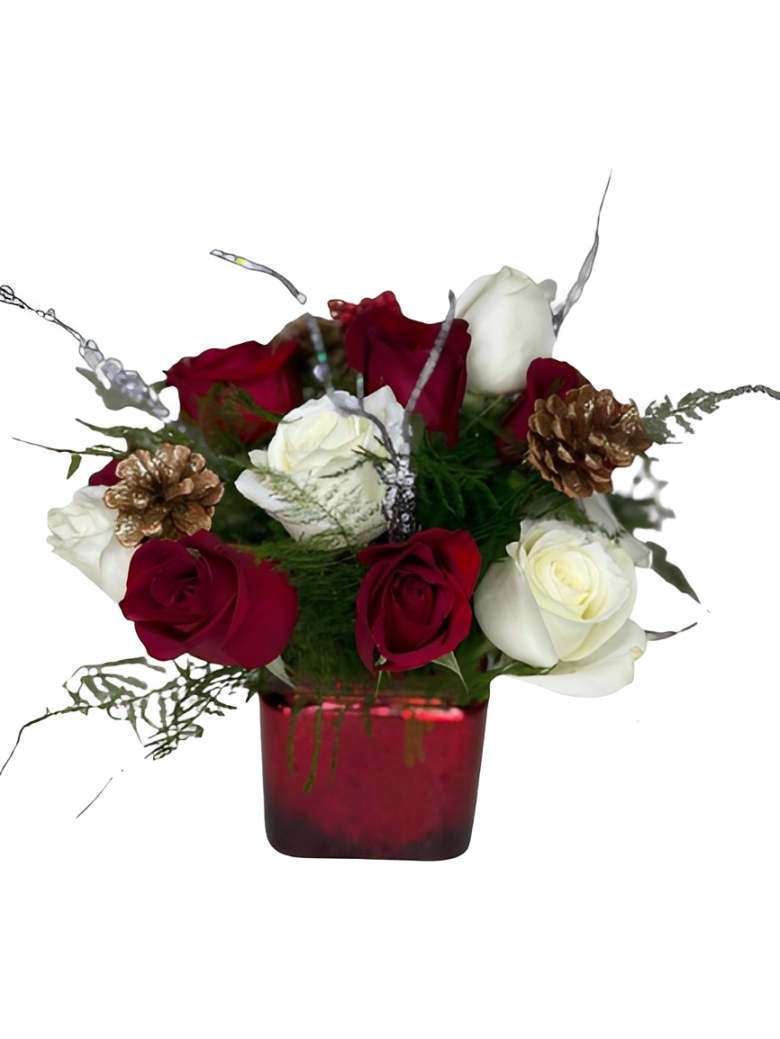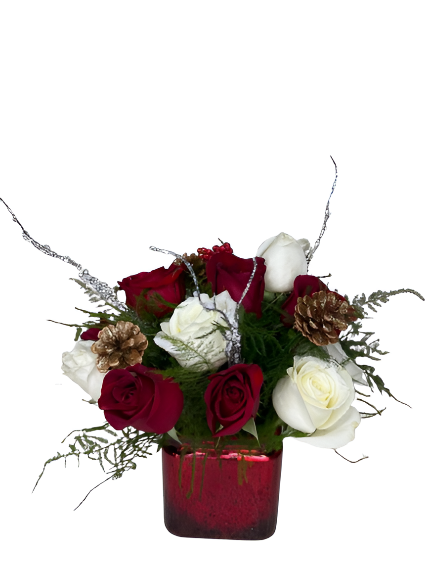 The Crimson Winter Elegance bouquet captures the warmth of heartfelt affection during the season’s most cherished moments. Featuring deep crimson roses that embody enduring passion and true devotion, this arrangement is artfully designed with delicate seasonal blooms and lush greenery for a perfectly balanced, sophisticated presentation. Encased in premium winter-themed paper and finished with an elegant satin bow, this bouquet radiates timeless charm that feels genuinely luxurious and deeply personal.