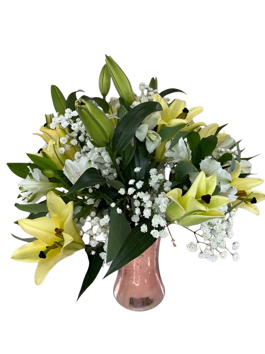The Golden Serenity Lily Bouquet is a thoughtfully curated floral arrangement that blends the cheerful charm of pale yellow lilies with the airy delicacy of white baby’s breath. These lilies symbolize happiness, positivity, and new beginnings, while the subtle white blooms add balance and graceful simplicity. Lush green foliage provides a fresh, vibrant backdrop, and the stylish rose-gold vase delivers a modern, sophisticated finish. Perfect as a heartfelt gift or elegant home decor, this bouquet radiates calm beauty and timeless elegance, making everyday moments and celebrations truly memorable.