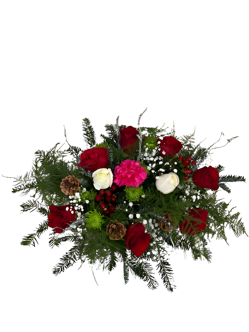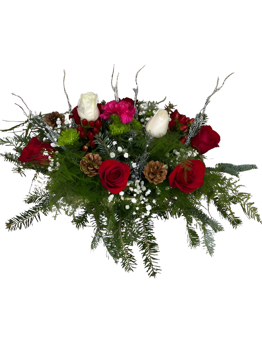 Winter Evergreen Harmony is a stunning floral arrangement crafted to embody both seasonal spirit and heartfelt emotion. This exquisite bouquet combines vibrant pink roses, pristine white lilies, delicate greenery, and subtle frosted accents—bringing harmony, elegance, and natural freshness to your celebrations or home decor.